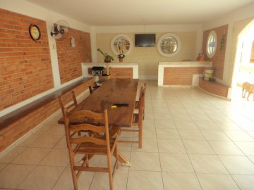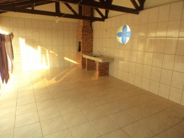 Salão para a piscina, com outra churrasqueira, dispensa e banheiro.